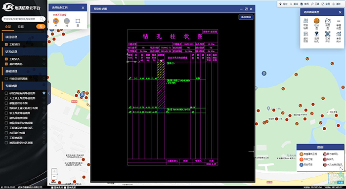 平臺基于標(biāo)準(zhǔn)化的工作流程,采用多重校審及分級管控的手段,通過配置,完成了從數(shù)據(jù)歸檔入庫到在線借閱的全過程服務(wù)與管理,滿足生產(chǎn)效率的同時(shí)保證了數(shù)據(jù)的準(zhǔn)確性及安全性。平臺支持鉆孔地層的標(biāo)準(zhǔn)化,完成了歷史存量數(shù)據(jù)的坐標(biāo)轉(zhuǎn)換,解決了因地層代號和坐標(biāo)系不統(tǒng)一而無法共享的問題。平臺實(shí)現(xiàn)了在網(wǎng)頁端基于CAD繪制勘察圖件的功能,支持柱狀圖、剖面圖、等值線圖的自動(dòng)生成?捎嗅槍π缘膶ρ芯繀^(qū)域鉆孔篩選過濾,使統(tǒng)計(jì)分析結(jié)果可靠度更高。平臺具有較完善的數(shù)據(jù)接口,實(shí)現(xiàn)了與公司自主研發(fā)的勘察資料處理軟件的無縫對接,兼容各種地質(zhì)專題GIS數(shù)據(jù)。不僅可直接入庫勘察軟件數(shù)據(jù),還能以項(xiàng)目和鉆孔的維度輸出涵蓋地層及試驗(yàn)信息的可在勘察軟件中直接利用的文件。