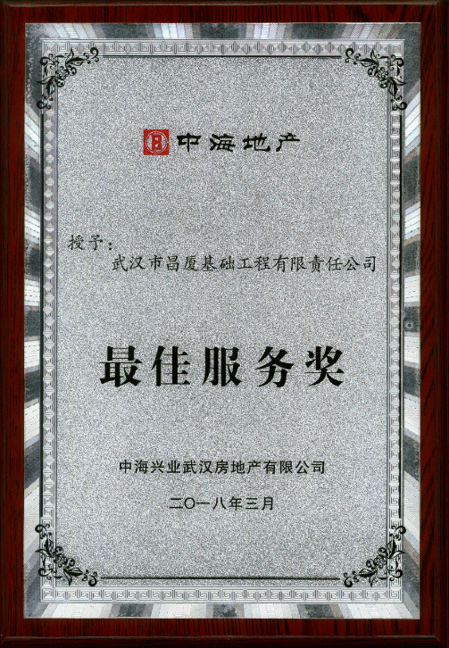 2018年3月27日,在中海地產(chǎn)武漢公司舉辦的“中海地產(chǎn)武漢供應(yīng)商大會(huì)”上,中海地產(chǎn)武漢公司為我司頒發(fā)了“中海地產(chǎn)最佳服務(wù)獎(jiǎng)”的獎(jiǎng)牌,基礎(chǔ)工程公司總經(jīng)理洪興全上臺(tái)領(lǐng)獎(jiǎng)。