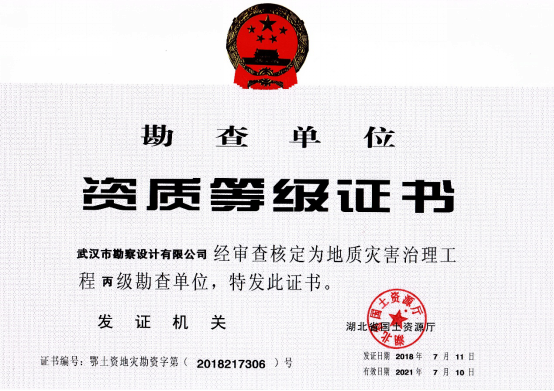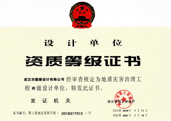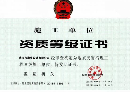 近日,湖北省國土資源廳發(fā)布了關(guān)于2018年度地質(zhì)災(zāi)害危險性評估和治理工程資質(zhì)(新立、升級)審批結(jié)果的公告,公司地質(zhì)災(zāi)害危險性評估和地質(zhì)災(zāi)害治理工程勘查、設(shè)計、施工資質(zhì)申請一次性順利通過國土資源部審核,并成功取得了資質(zhì)證書。