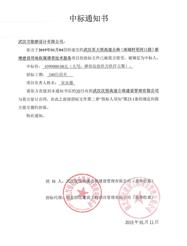 2019年1月11日,中國(guó)招投標(biāo)公共服務(wù)平臺(tái)發(fā)布公告,我司成功中標(biāo)武漢至大悟高速公路(南湖村至河口段)新增建設(shè)用地權(quán)屬調(diào)查技術(shù)服務(wù)項(xiàng)目,中標(biāo)價(jià)格為459.9萬(wàn)元,該項(xiàng)目建設(shè)單位為武漢漢悟高速公路建設(shè)管理有限公司。