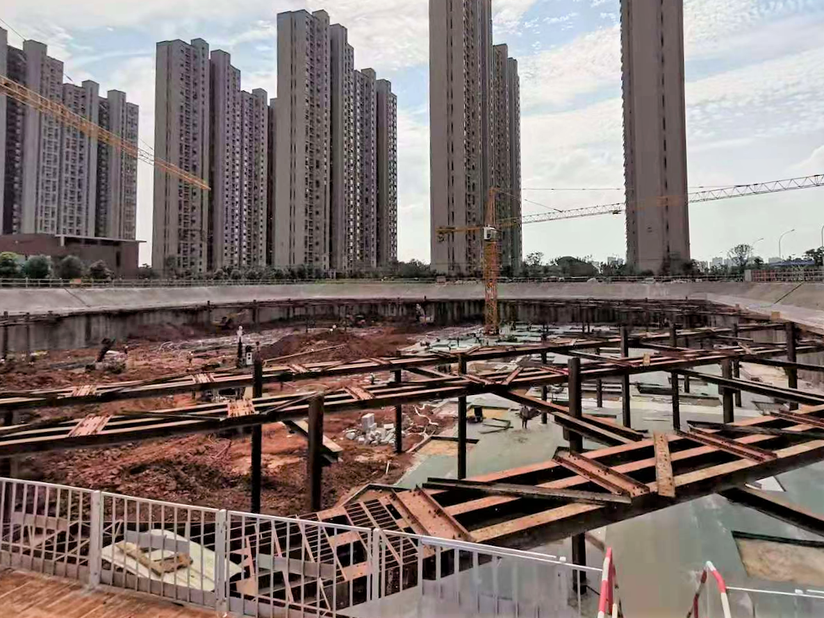 該項(xiàng)目位于武漢市洪山區(qū)青菱新區(qū),地下設(shè)兩層地下室,基坑開挖面積14600㎡,基坑周長476m,基坑開挖深度9.8m—13.6m。在項(xiàng)目方案設(shè)計(jì)階段,設(shè)計(jì)中心技術(shù)團(tuán)隊(duì)經(jīng)充分討論后決定大膽創(chuàng)新,采用型鋼組合支撐的綠色新工藝,該工藝是武漢市兩層地下室基坑工程中的首次成功應(yīng)用。